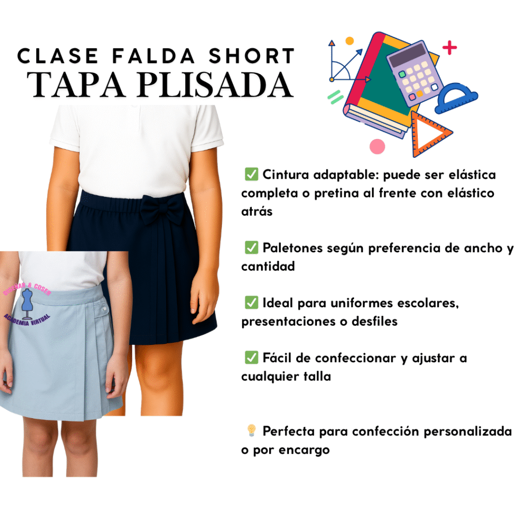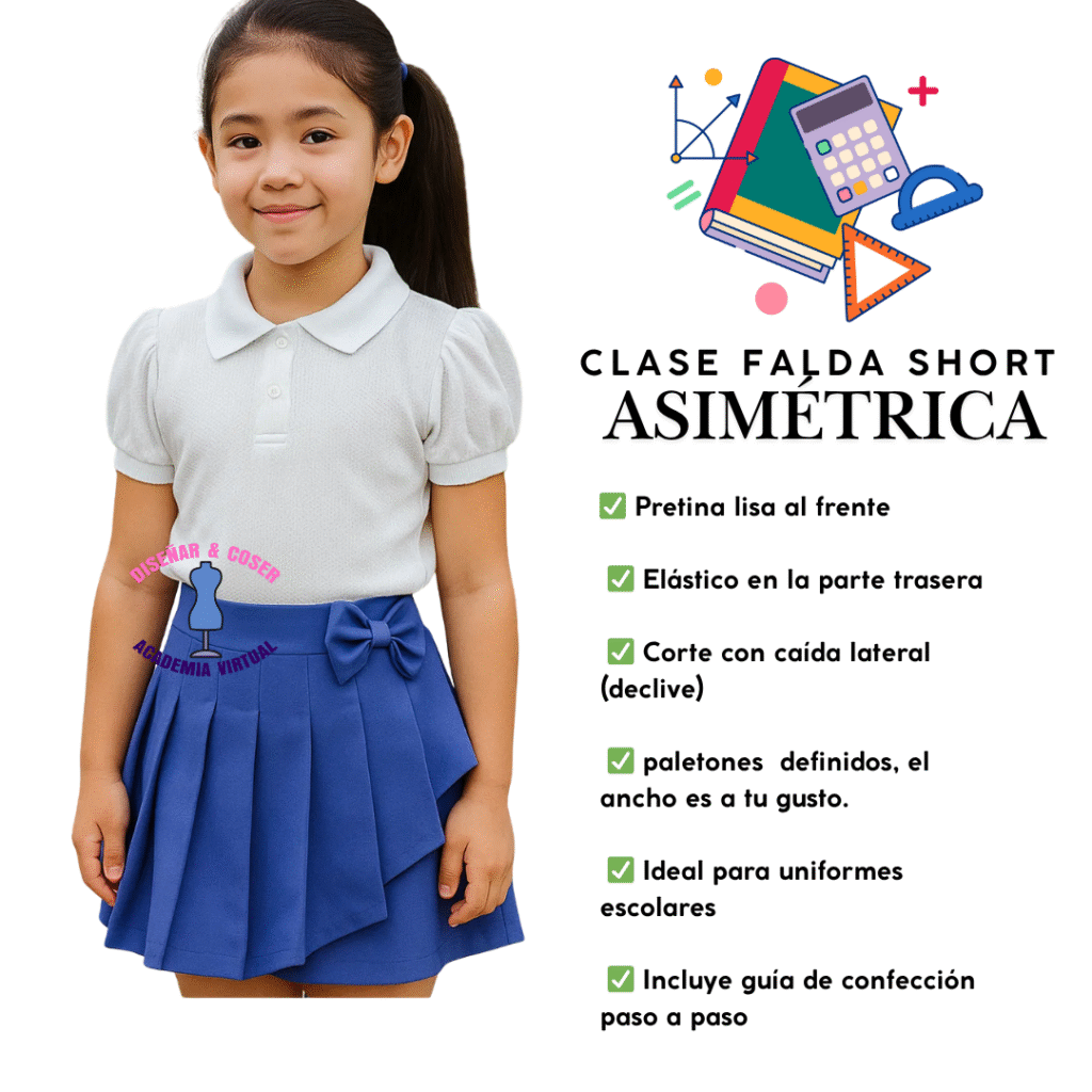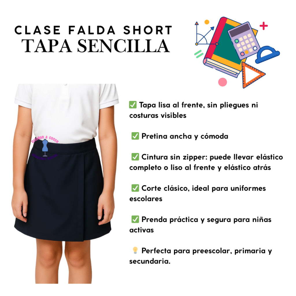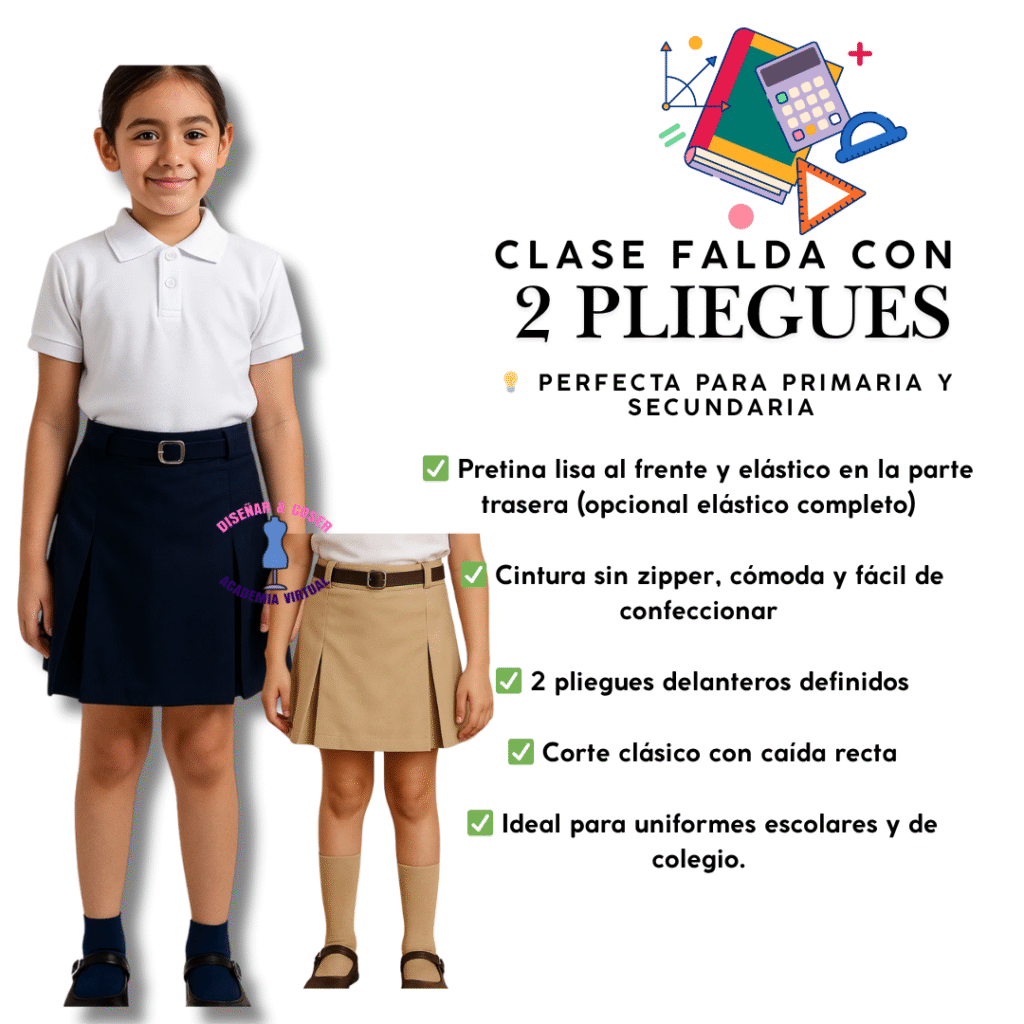 Accedé de por vida al curso completo — sin mensualidades — y aprendé a confeccionar 6 tipos de faldas, 3 pantalones, 2 shorts, camisetas escolares, de kinder y suéter. Todo con clases paso a paso, moldes listos y asesoría personalizada durante tu proceso. 💙